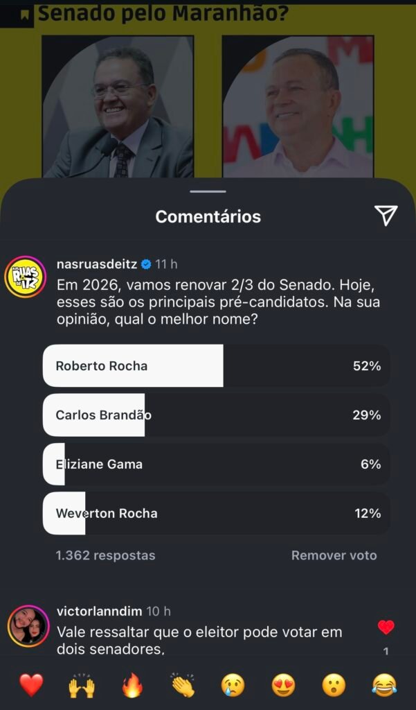 A enquete, ainda que não definitiva, serve como um terrmômetro político e mostra que, mesmo longe dos holofotes, Roberto Rocha continua sendo um nome forte no Maranhão. Se essa tendência se confirmar nas urnas, o ex-senador pode estar prestes a retomar seu espaço com força total.