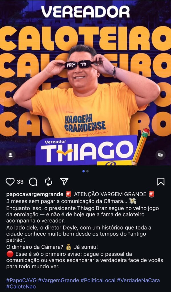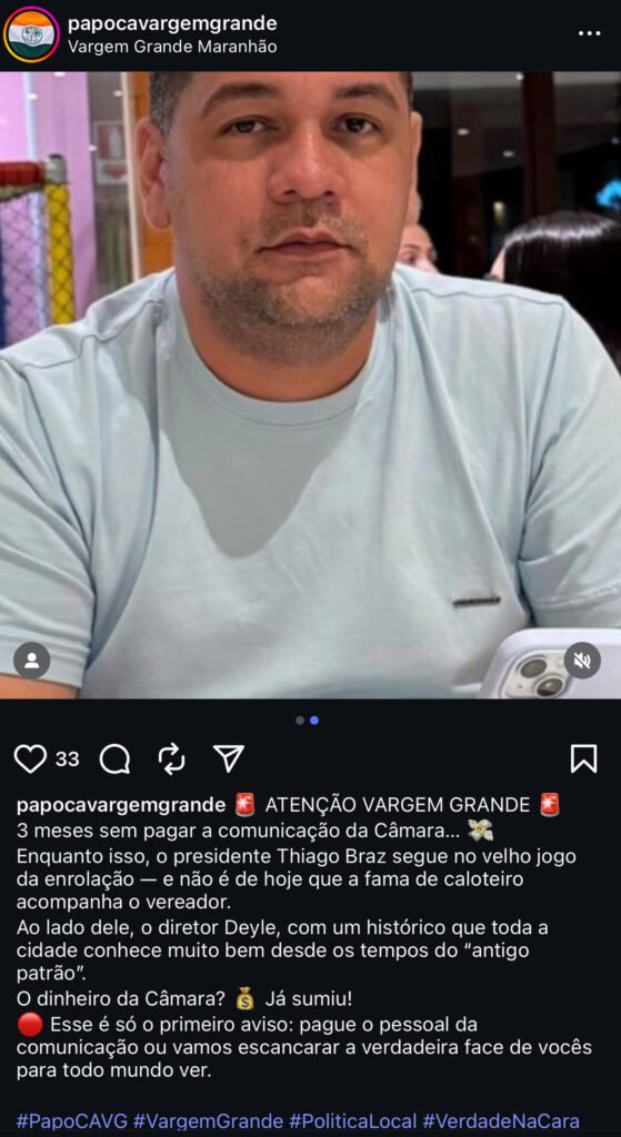 O presidente da Câmara de Vargem Grande e Secretário de Educação, Tiago Braz, se encontra no centro de uma polêmica que levanta sérias questões sobre a gestão de recursos públicos e a ética na política local. Acusações de que a Câmara não estaria honrando seus compromissos financeiros com o pessoal responsável pela comunicação vêm à tona, alimentando especulações sobre a conduta do gestor.