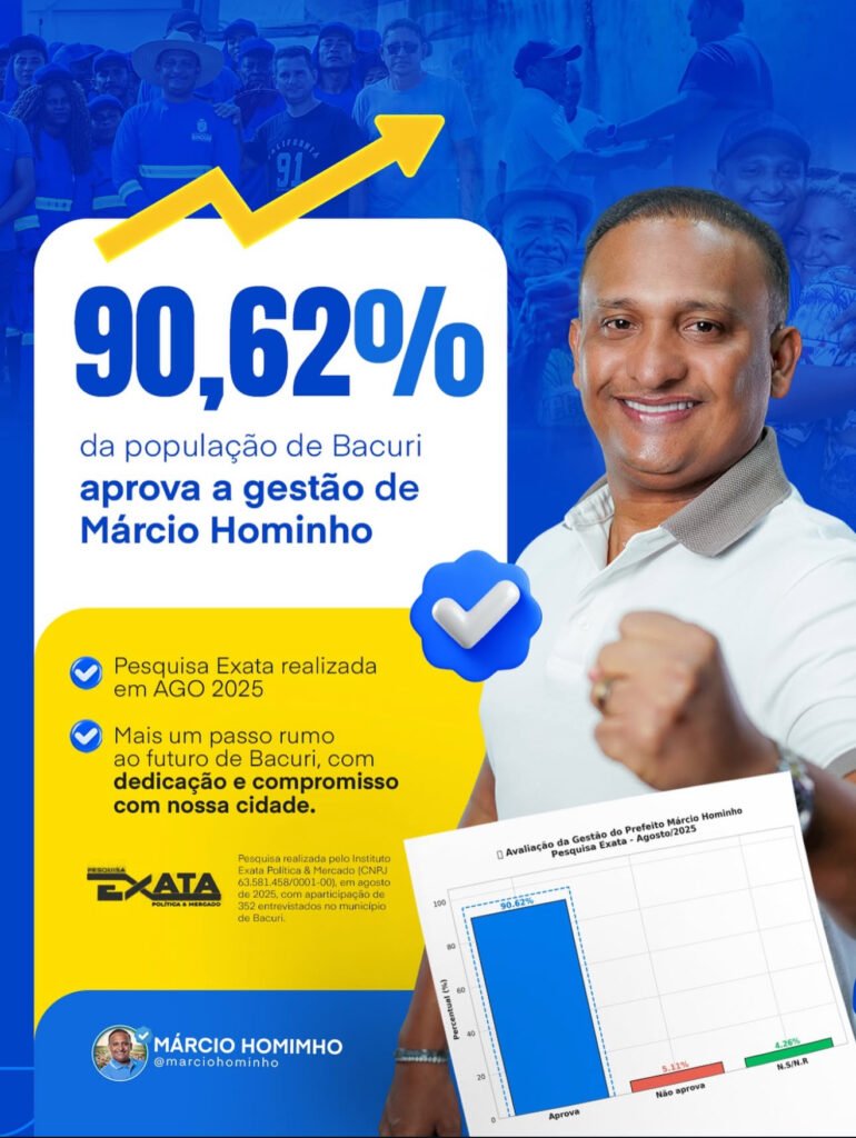 Uma pesquisa recente confirma o sucesso da gestão do prefeito Marinho, de Bacuri, com uma impressionante aprovação de 90,62%. O resultado reflete a satisfação da população com o trabalho realizado.