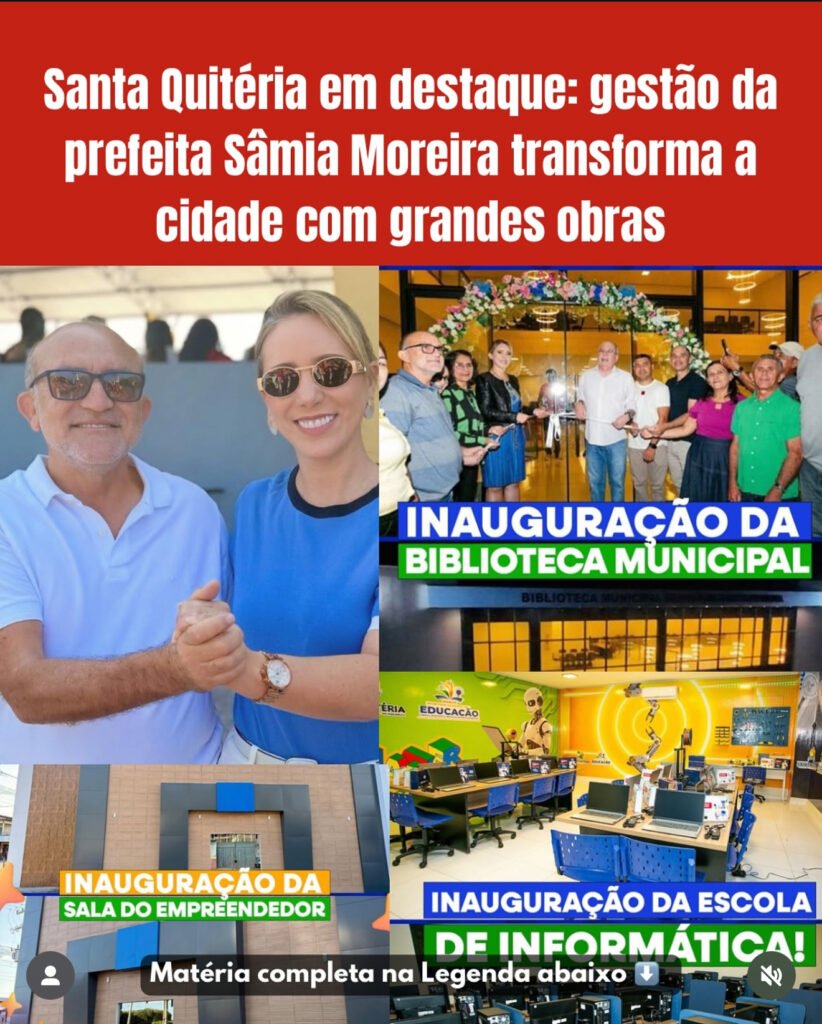 A gestão da prefeita Sâmia Moreira tem colocado Santa Quitéria no mapa como referência em estrutura e desenvolvimento. Com investimentos marcantes e obras de grande impacto, a cidade hoje ostenta conquistas que se destacam em toda a região.