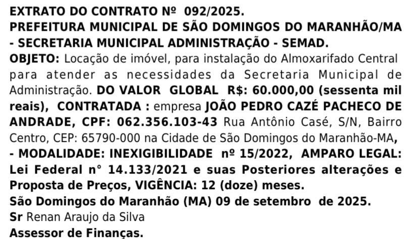 Trata-se do EXTRATO DO CONTRATO Nº 092/2025, que oficializa a “Locação de imóvel, para instalação do Almoxarifado Central”. O valor global do contrato é de R$ 60.000,00 (sessenta mil reais), com vigência de 12 meses.