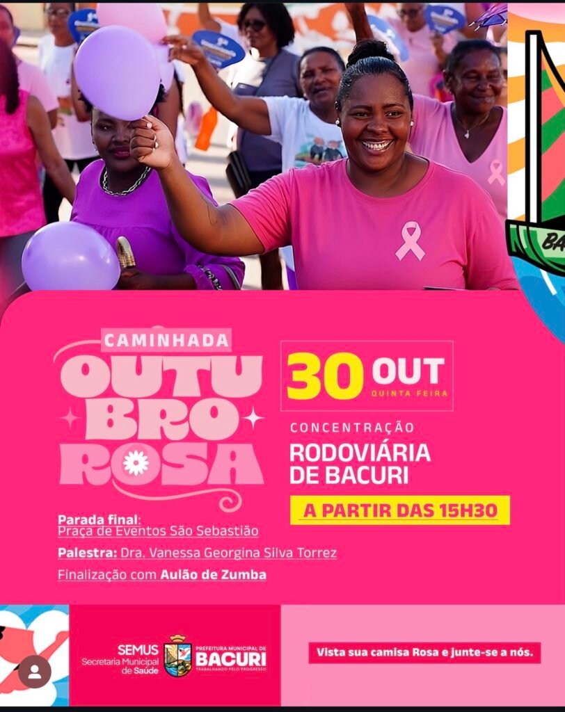 A Prefeitura de Bacuri, através da Secretaria Municipal de Saúde (SEMUS), realiza nesta quinta-feira, 30 de outubro, a “Caminhada Outubro Rosa”. O evento encerra o mês de mobilização e tem como objetivo principal reforçar a importância da prevenção e do diagnóstico precoce do câncer de mama no município.