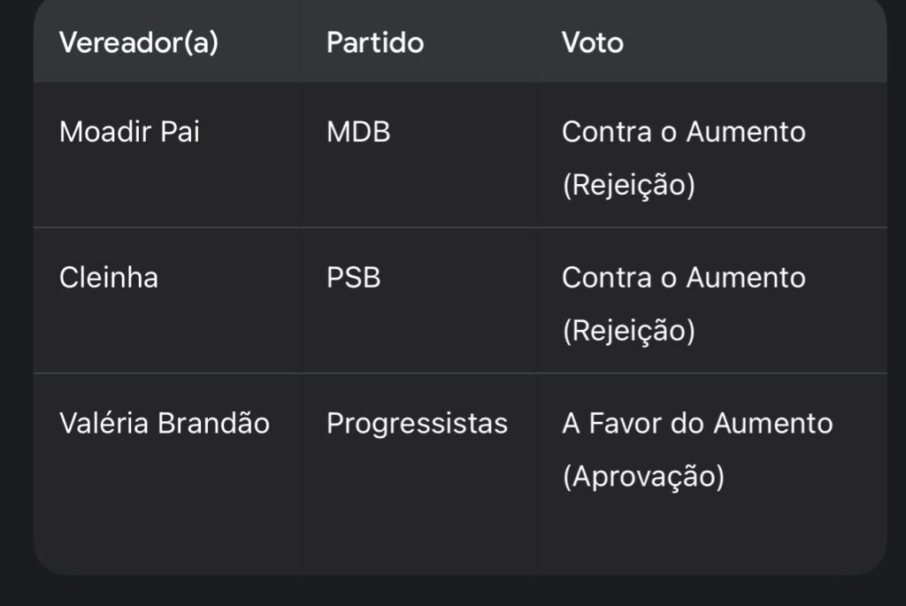 A decisão que barrou o aumento foi garantida pelo voto de Moadir Pai (MDB), acompanhado pela vereadora Cleinha (PSB). Ambos votaram pela derrubada do projeto enviado pelo Executivo, defendendo o interesse da população.