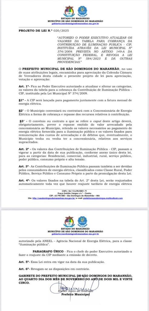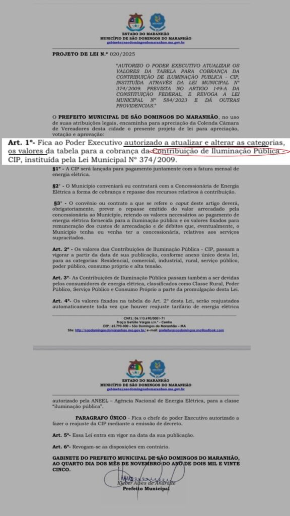 Uma importante vitória para os contribuintes de São Domingos do Maranhão (MA) foi consolidada na manhã de hoje (10/11/2025). A Comissão de Constituição e Justiça (CCJ) da Câmara Municipal rejeitou o Projeto de Lei N.° 020/2025, de autoria do Prefeito Tratorzão (Kleber), que buscava aumentar a cobrança da Contribuição de Iluminação Pública (CIP) no município.